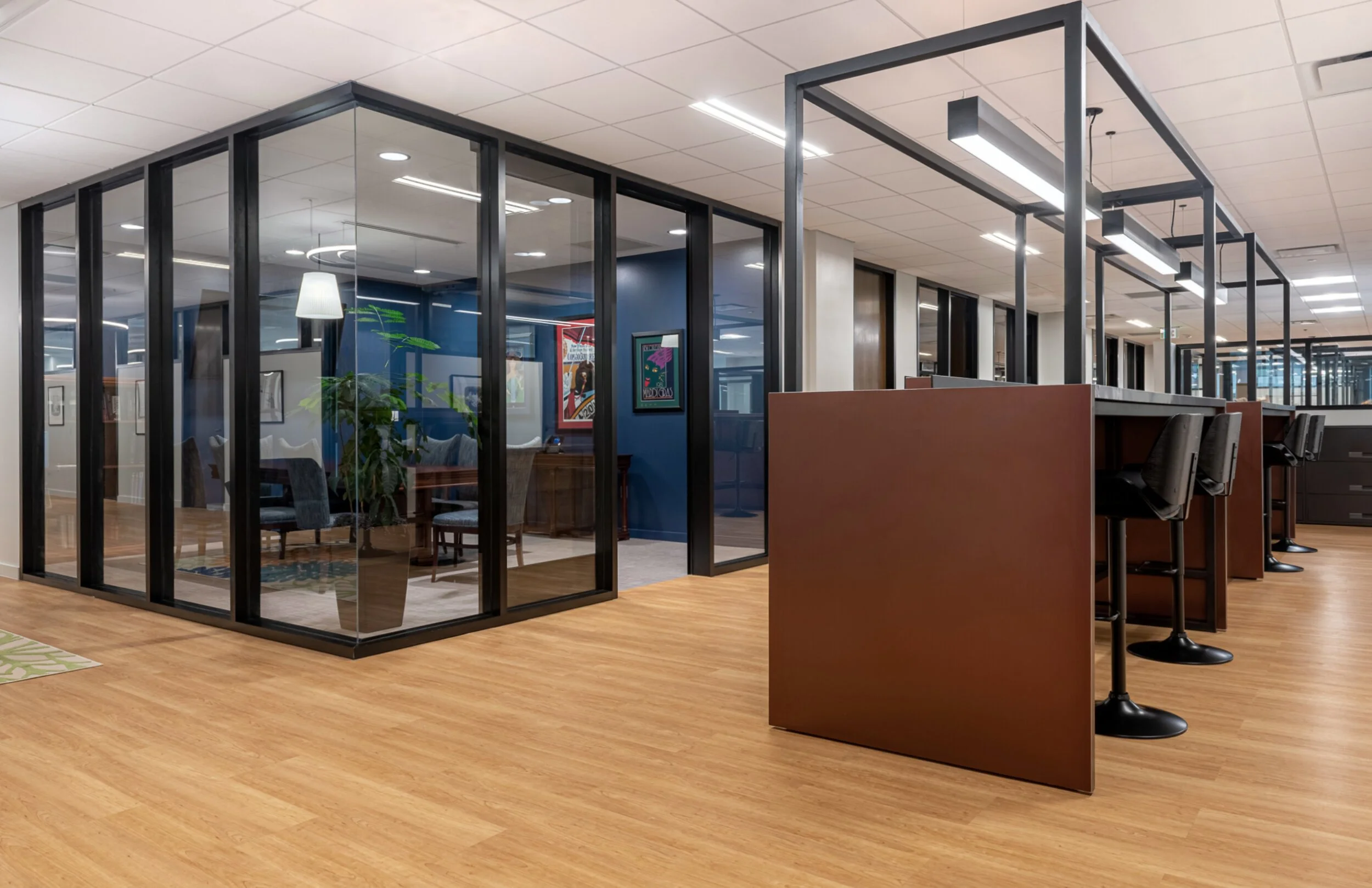 The new design focused on creating a combination of private offices, open air secretarial workstations, and dedicated collaboration spaces. The three dedicated team areas are organized around the “communal core” spaces, which include the shared conference rooms, team lounge, and reception lobby.